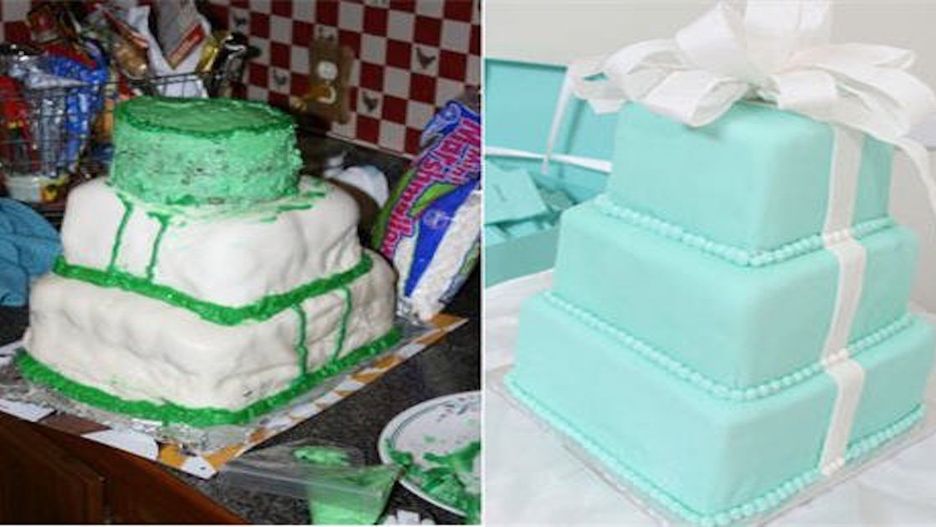 Po lewej stronie zdjęcie jak miał wyglądać tort. Po prawej zdjęcie tortu, jaki otrzymała młoda para.