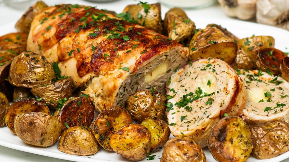 Drobiowa rolada w rozmiarze XXL w towarzystwie pieczonych ziemniaków. Gotowy pomysł na smaczny obiad na każdą okazję