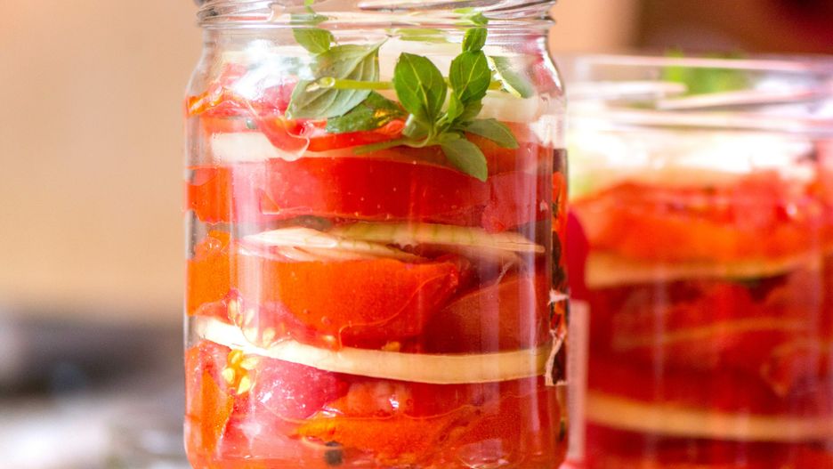 - W wyparzonych słoikach układaj naprzemiennie pomidory i cebulę, posypując warstwy solą i pieprzem według uznania.