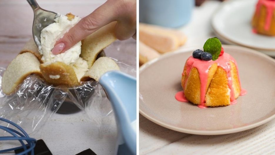 Na początek przygotuj miseczki, w których zrobimy nasze desery bez pieczenia. Wyłóż je folią spożywczą, dzięki której w szybki prosty i sposób wyjmiesz słodkości z foremki. Następnie przetnij w poziomie biszkopty na pół, po czym zanurz każdy element w miseczce z mlekiem.