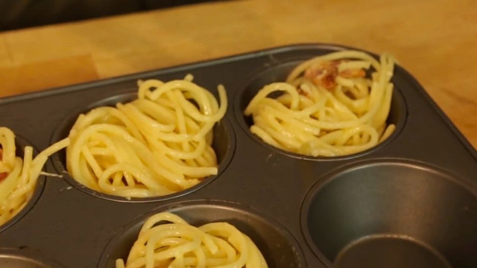 W międzyczasie przygotuj muffinki. Za pomocą szczypców do makaronu, umieść spaghetti z kilkoma kawałkami boczku do formy. Zostaw trochę miejsca na górze, bo najlepsze dopiero przed nami.