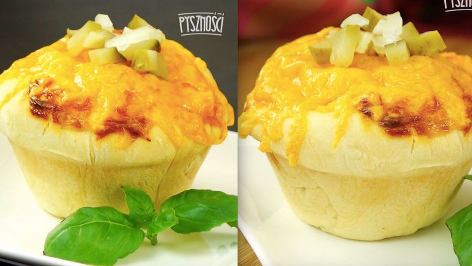 Pyszne babeczki z kiełbasą, serem, korniszonami i cebulą