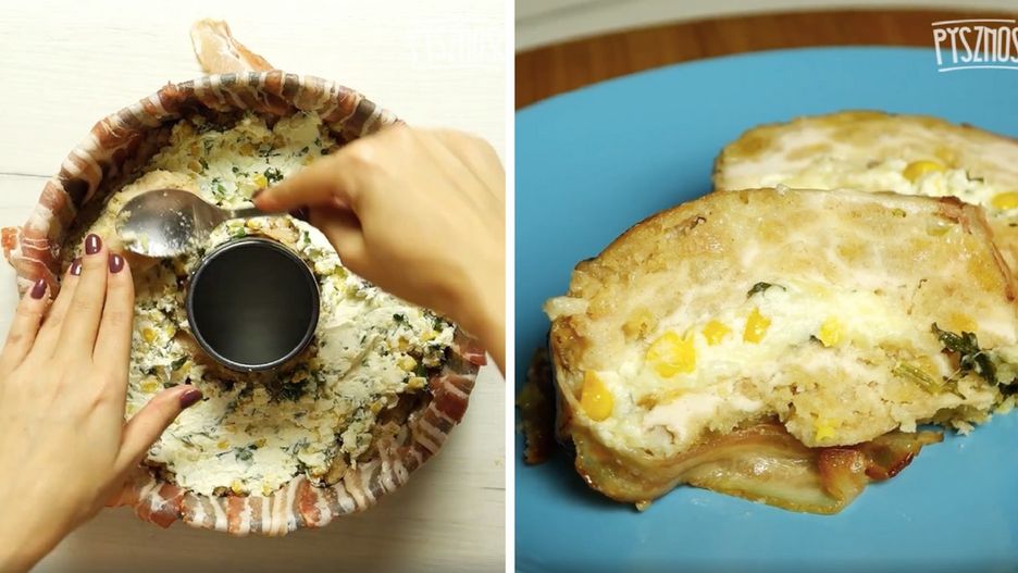 Tym razem przygotowaliśmy dla Was oryginalną babkę z mięsnym farszem. To prawdziwa gratka dla wszystkich miłośników mięsnych smakołyków. Oprócz kurczaka w tym niecodziennym połączeniu znajdziecie również boczek :)