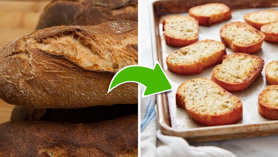 - Podziel bagietkę na mniejsze kawałki. Obie końcówki wykorzystaj na grzanki lub do zrobienia domowej bułki tartej.
