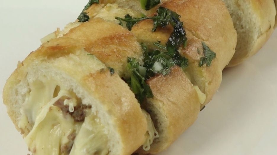 Zapiekana bagietka z masłem czosnkowym nadziewana mięsem mielonym i żółtym serem