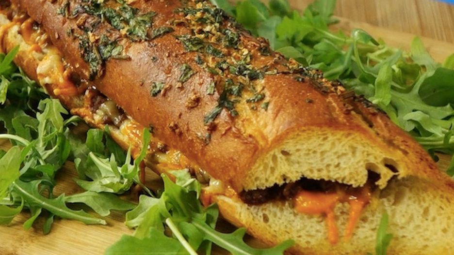 Poniżej zobaczysz przepis na przyrządzenie bagietki z wołowiną, sosem barbecue, jalapeño, serem i masłem czosnkowym.