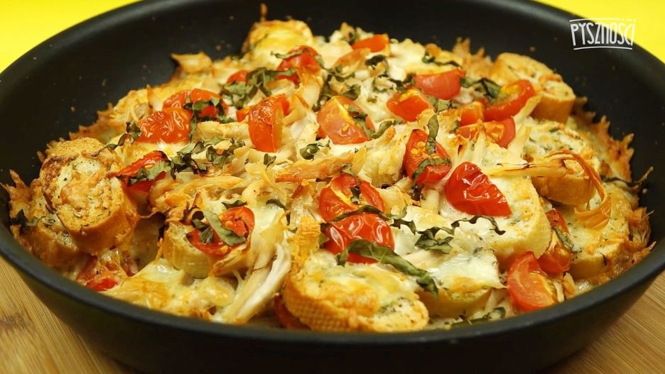 Bagietka zapiekana z kurczakiem, mozzarellą, pomidorkami i bazylią
