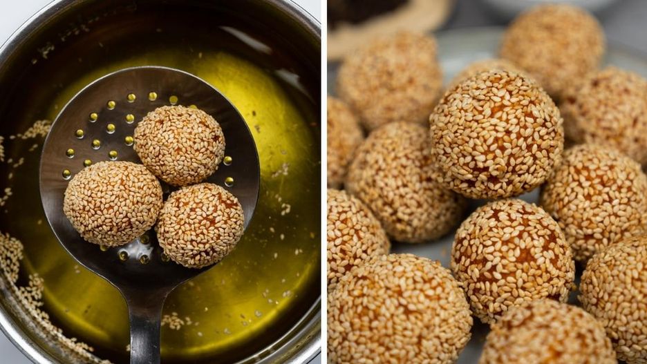 Teraz przesyp do miski sezam, po czym obtocz w nim batatowe kuleczki. Następnie ułóż je na desce do krojenia, po czym podgrzej olej w dużym garnku.