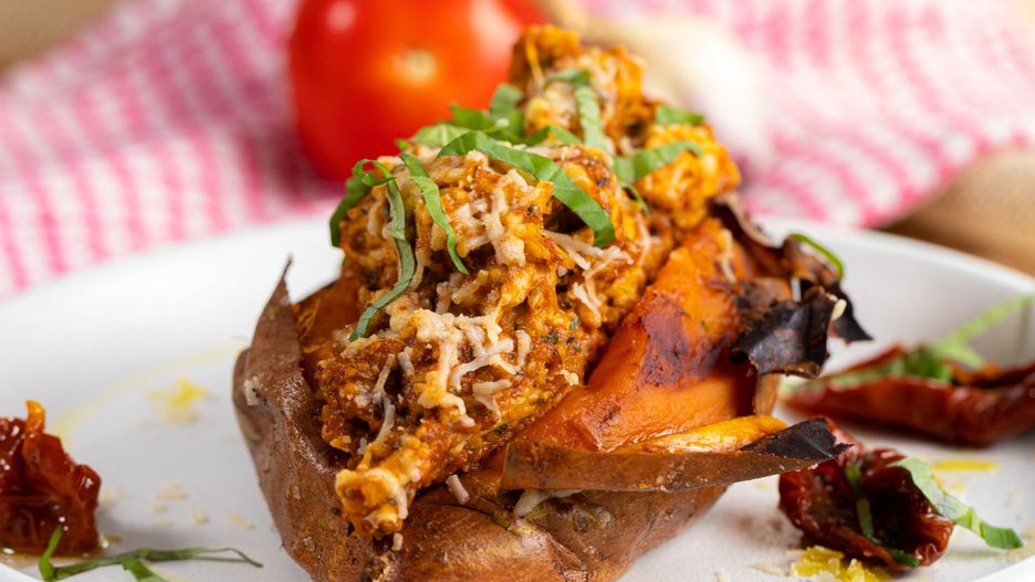 Bataty faszerowane kurczakiem z czerwonym pesto