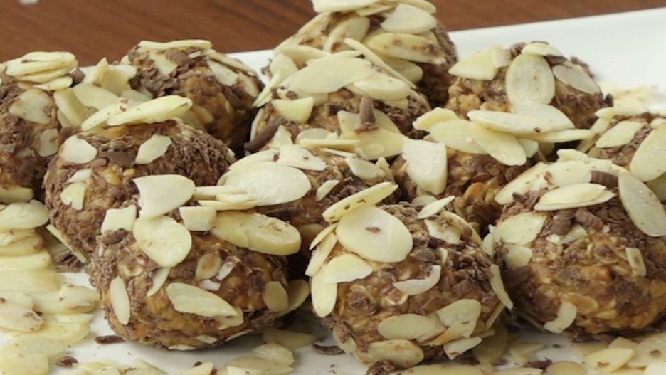 4. Na stole rozsyp pozostałą ilość startej czekolady oraz migdały w płatkach i przeturlaj w nich ulepione kulki tak, aby były pokryte z zewnątrz czekoladą oraz migdałami.