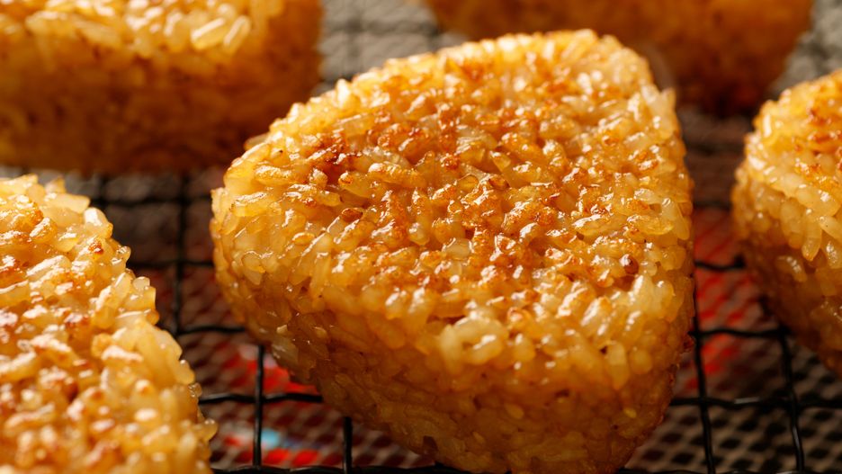 - Następnie rozgrzej oliwę na patelni na średnim ogniu. Ułóż kulki ryżowe na patelni i posmaruj je sosem sojowym. Smaż przez 3-4 minuty z każdej strony, aż nabiorą złocistego koloru.