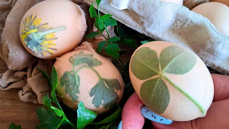 Następnie przygotowuję jajka. Używam białych lub bardzo jasnych – wtedy wzory są bardziej widoczne. Każde jajko myję, by pozbyć się tłuszczu. Na skorupce układam listki – najczęściej pietruszkę, ale świetnie sprawdzają się też liście mniszka, szczawiu, tymianku czy nawet kwiaty jabłoni. Zwilżam je w ciepłej wodzie, żeby lepiej przylegały do jajka, a potem ostrożnie owijam je kawałkiem pończochy i mocno zawiązuję sznurkiem.