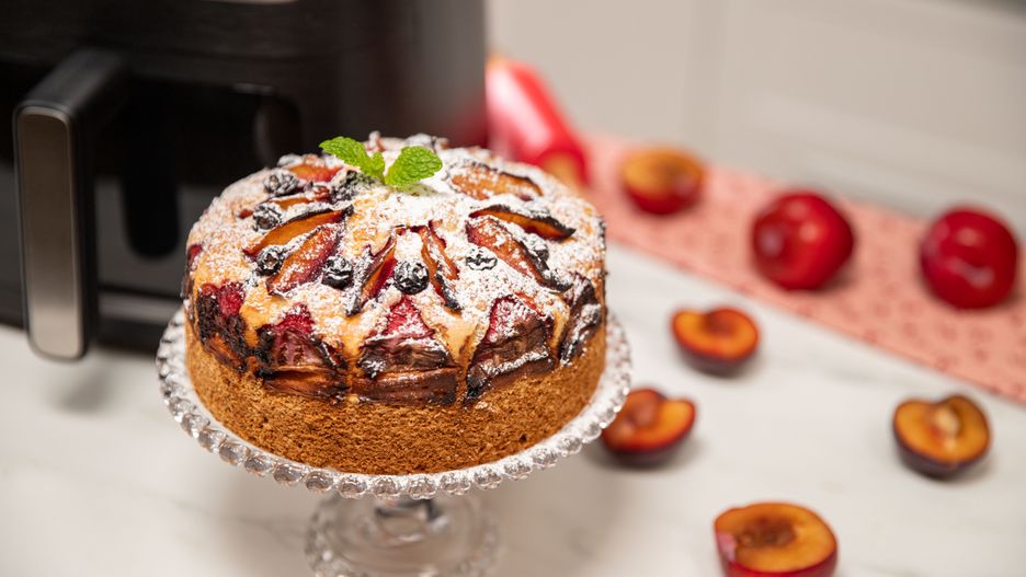 Ciasto biszkoptowe z owocami pieczone we frytkownicy beztłuszczowej