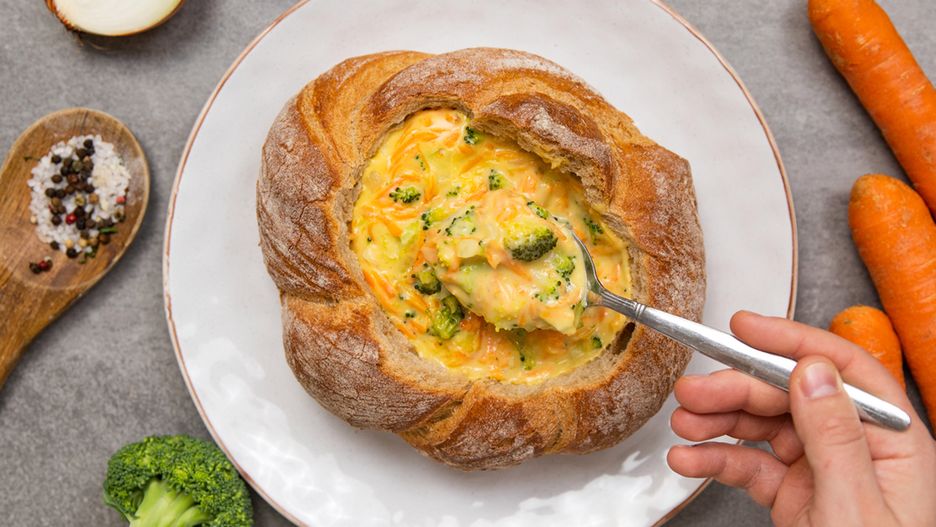 Brokułowa zupa z serem podawana w chlebie. Idealnie kremowa i pyszna