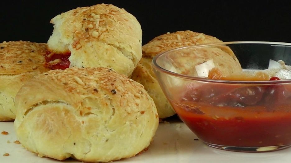 Pyszne pieczone bułeczki nadziewane mozzarellą, salami i sosem pomidorowym
