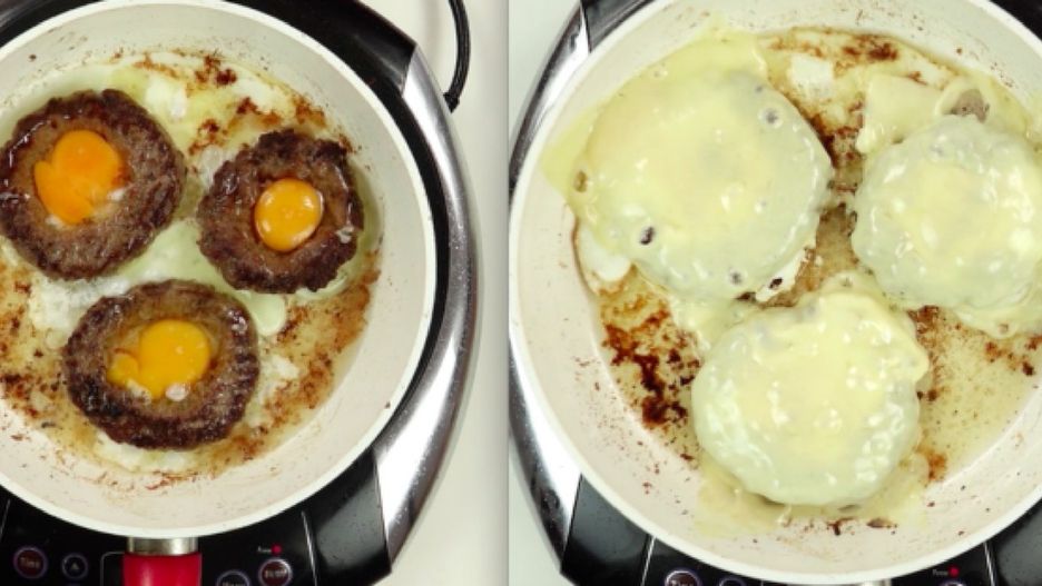 2. Rozgrzej patelnię, a następnie wrzuć na nią masło. Kiedy się roztopi, włóż na patelnię krążki z mięsa mielonego. Smaż przez 2 minuty, a następnie przewróć na drugą stronę. Do środka każdego krążka wbij po 1 jajku i przypraw je z wierzchu solą i pieprzem. Przykryj patelnię pokrywką. Kiedy białka się zetną, zdejmij pokrywkę i na każdym kawałku mięsa połóż po 1 plastrze sera żółtego. Kiedy ser się roztopi, zdejmij patelnię z ognia.