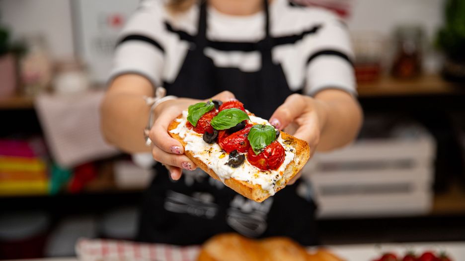Krok 4: Na grzankę z burratą wykładam również podpieczone pomidory z odrobiną oliwy, która pozostała na dnie naczynia oraz pokrojone oliwki. Dekoruję całość listkami świeżej bazylii i podaję od razu. Smacznego!