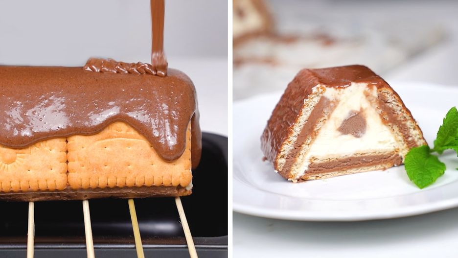 Następnie wyłóż kolejną warstwę herbatników i rozprowadź na nich tym razem jasny krem. Na środku zrób pasek z kakaowej masy przy pomocy szprycy.