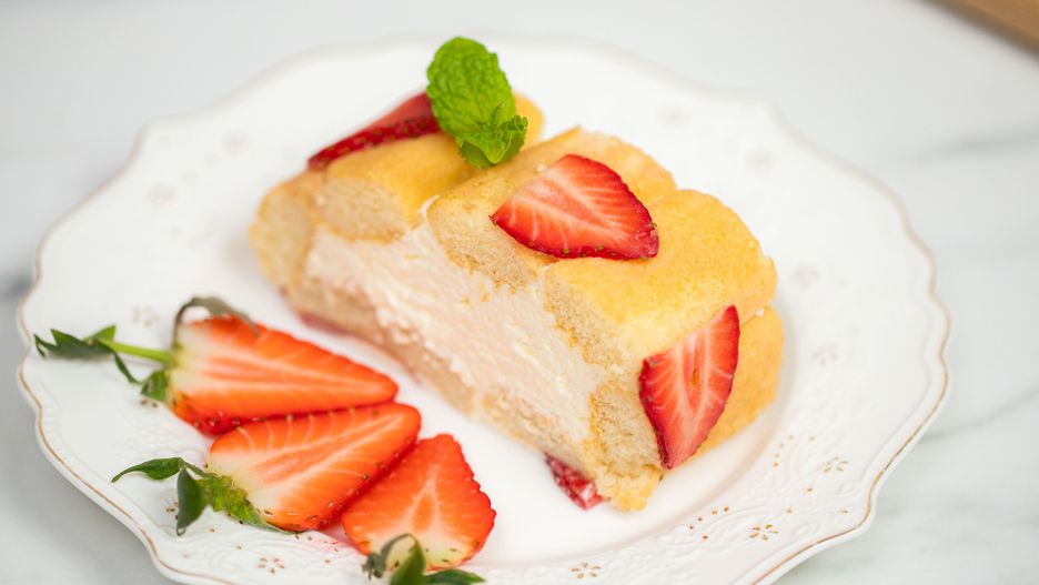 Krok 6. Na koniec zwijam deser w ciasny rulon i wkładam go na całą noc do lodówki. Następnego dnia dzielę go na mniejsze kawałki i serwuję ze świeżymi truskawkami i zieloną miętą. I to wszystko, smacznego!