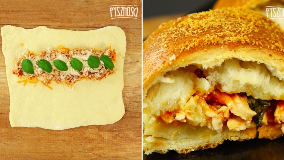 Poniżej znajdziesz przepis na przyrządzenie chleba nadziewanego serem, kurczakiem, sosem pomidorowym i bazylią.