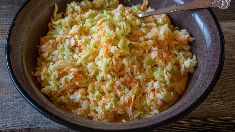 - Wymieszaj wszystko starannie przy pomocy łyżki, dbając o to, by kremowy dressing dotarł do każdego kawałka kapusty i marchewki.