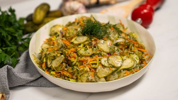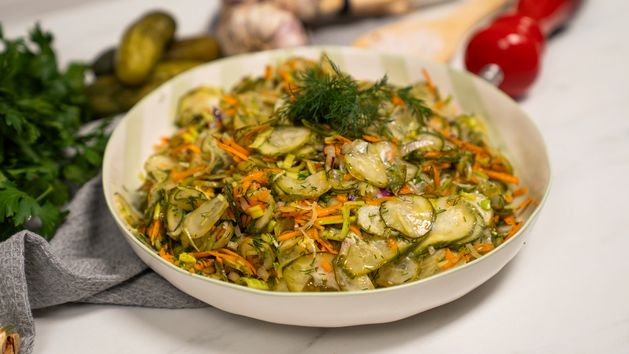 Surówka z ogórków małosolnych to idealny dodatek do letnich dań – lekka, orzeźwiająca i pełna smaku. W tej wersji klasykę wzbogacają chrupiąca marchewka, delikatny por, czerwona cebula i solidna garść świeżego koperku. Wszystko to skropione oliwą z oliwek i doprawione do smaku, tworzy harmonijną kompozycję, która świetnie sprawdzi się do dań z grilla, obiadu czy na kolację. Przepis jest szybki, prosty i pozwala wykorzystać sezonowe ogórki małosolne w niebanalny sposób. To surówka, która smakuje tak dobrze, że znika z talerzy, zanim zdążysz postawić drugie danie!