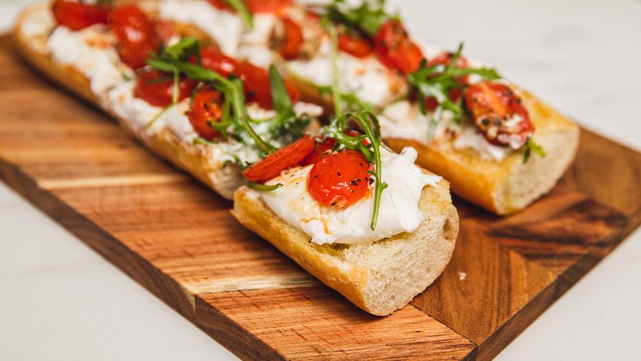 Proste i pyszne grzanki z bagietki ze śmietankową burratą i pieczonych pomidorków koktajlowych. Zdrowy i szybki przepis na kolację we włoskim stylu.