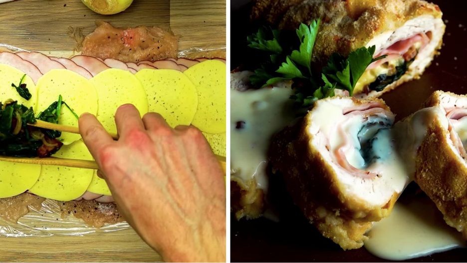 Chrupiące roladki z kurczaka z szynką, serem i szpinakiem w sosie. Przepis na pyszny obiad