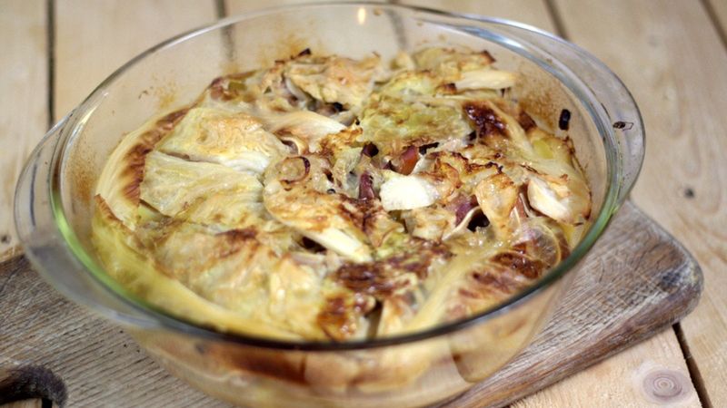 - Naczynie do zapiekania wysmaruj tłuszczem. Ułóż połowę kapusty, na niej połowę ziemniaków, cebulę z uszami, przykryj resztą ziemniaków i kapusty.
