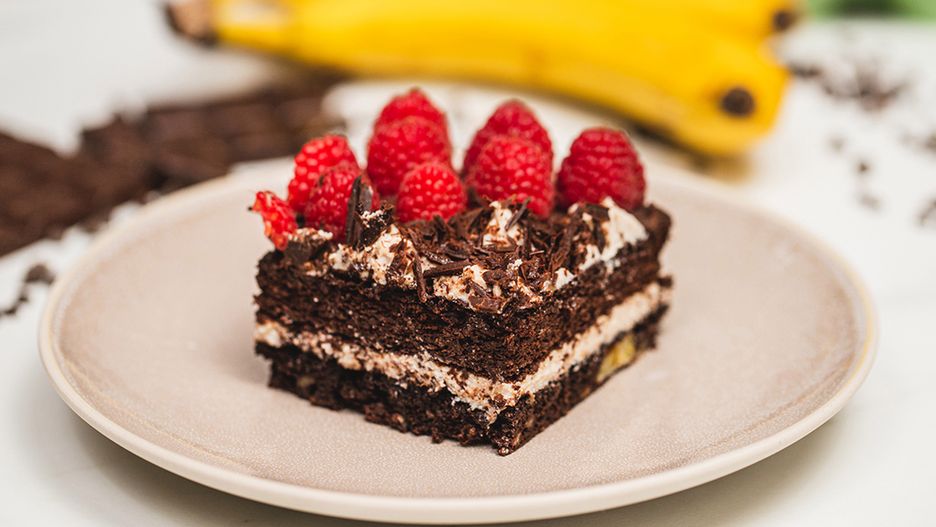 Pozostałą część masy wyłóż na górę ciasta, zajmując ok. połowę przestrzeni i posyp posiekaną czekoladą. W drugiej części rozprowadź roztopioną czekoladę i wyłóż maliny. Nasze lekkie i pyszne ciasto bananowe jest już gotowe.