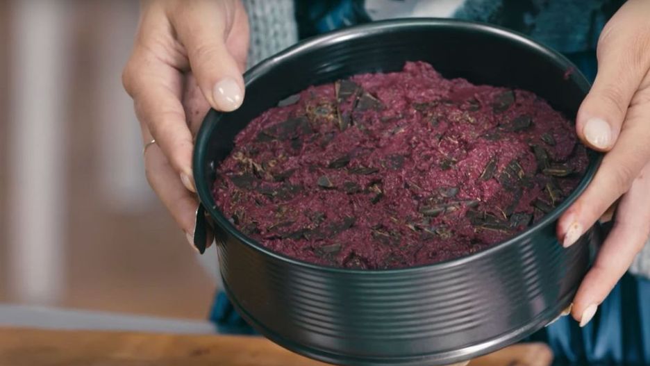 - Dodaj 200 g buraków do ciasta i miksuj przez minutę mikserem.