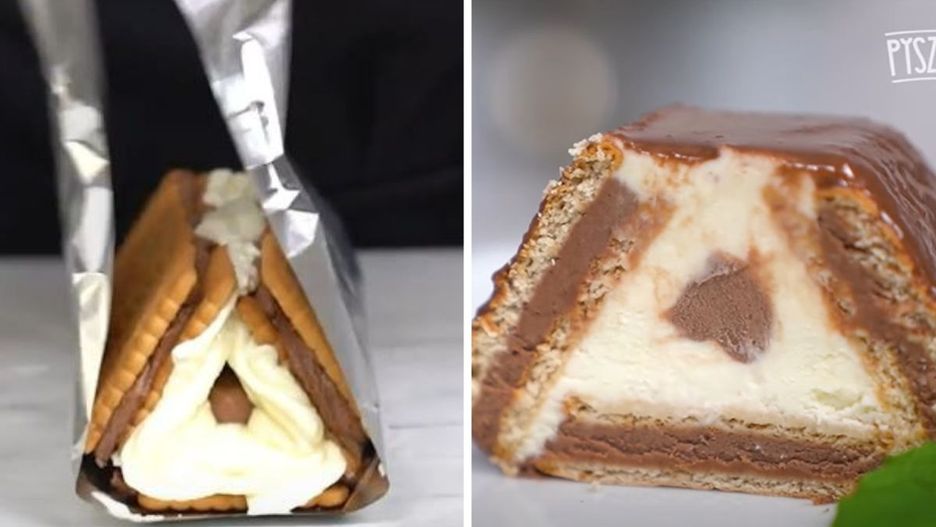 - Ciasto złóż w trójkąt - chwyć dwa brzegi folii aluminiowej i połącz ze sobą. Przy pomocy szpatułki wygładź brzegi (przy składaniu krem może wydostać się ze środka) i wstaw do lodówki do stężenia na 4 godziny. Przez ten czas herbatniki ładnie namiękną i łatwiej będzie później kroić ciasto.