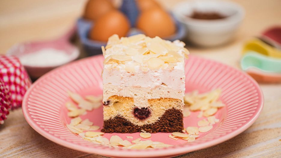 Następnie wyłóż masę z galaretki i bitej śmietany. Posyp całość płatkami migdałów i wstaw do lodówki. Ciasto powinno chłodzić się przez minimum 3 godziny. Po tym czasie nasz deser jest już gotowy. Pokrój go na kawałki i delektuj się smakiem jak za dawnych lat.