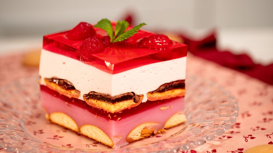 Ciasto Fiona to pyszny deser bez pieczenia, który zachwyca malinową pianką, galaretką i kremem budyniowym. Jest przyjemnie orzeźwiające, z przyjemnie zbalansowaną słodyczą.