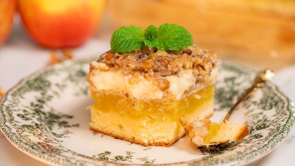 Ciasto jabłkowo-budyniowe pod orzechową pierzynką. Każda warstwa wypieku to prawdziwe złoto