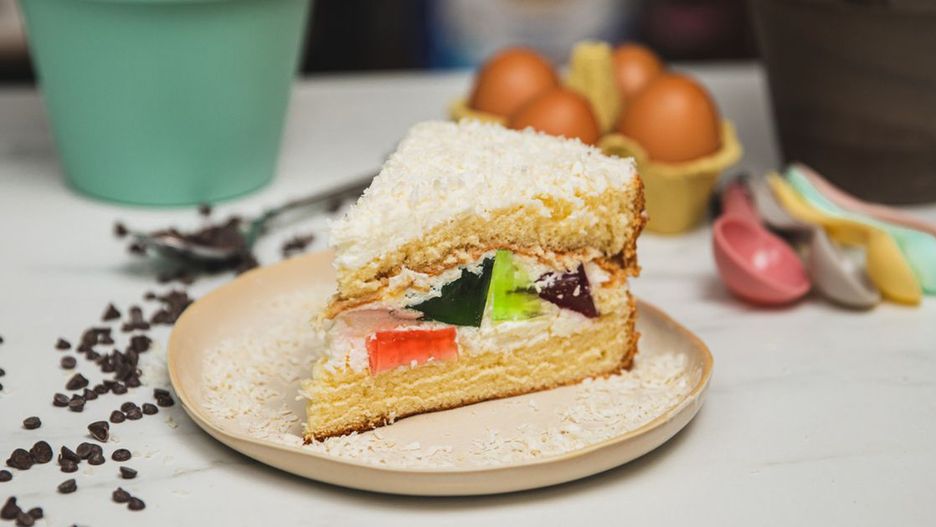 Zacznij od przygotowania galaretek, ponieważ muszą one przestygnąć i zastygnąć. Rozpuść je w wodzie, zgodnie z instrukcją na opakowaniu. My postawiliśmy na galaretkę truskawkową i agrestową, ale możesz wybrać również inne smaki. Postaraj się sięgnąć po kontrastujące ze sobą kolory, dzięki czemu ciasto będzie prezentowało się jeszcze lepiej.