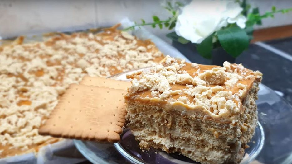 Na sam spód formy układamy herbatniki, a na nie przekładamy 1/3 masy. Następnie układamy kolejną warstwę herbatników i następną porcję masy. Łącznie mają to być 4 warstwy herbatników i 3 warstwy masy. Na samym wierzchu rozsmarowujemy pozostałą część kajmaku i posypujemy go pokruszoną chałwą. Ciasto wstawiamy do lodówki. Pamiętaj, że im dłużej pobędzie w lodówce, tym będzie smaczniejsze.