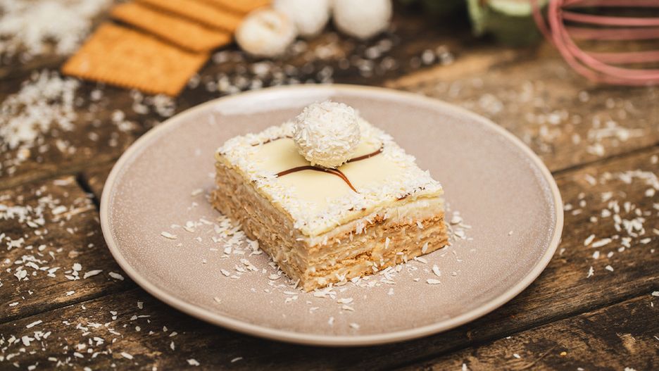 Kokosy kojarzą nam się zawsze z wakacjami na rajskiej wyspie. Dziś mamy dla Ciebie prosty deser, który przeniesie Cię w tropiki. Inspiracją do jego stworzenia były kultowe pralinki marki Ferrero z kokosem, białą czekoladą i migdałami. Do przygotowania naszego ciasta nie potrzebujesz nawet piekarnika- w roli spodu wystąpią herbatniki. Możesz je zastąpić również krakersami, których delikatnie słony smak przełamie słodką masę. Twoi bliscy z pewnością poproszą o dokładkę.