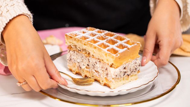 Ciasto bez pieczenia, ale z chrupiącymi i puszystymi brzegami. Jak to możliwe? Wystarczy, że do przepisu użyjesz domowych gofrów. Przełóż je aksamitnym kremem z kawałkami czekolady i deser dla całej rodziny jest już gotowy. Lista składników czeka poniżej. Nie zapomnij obejrzeć naszego wideo, gdzie krok po kroku pokazujemy, jak zrobić te słodkości.