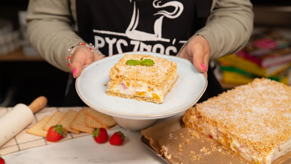 To ciasto szybko zasłuży sobie na miano ulubieńca całej rodziny. Herbatnikowy spód i krem śmietankowy z zatopionymi w środku owocami świetnie sprawdzi się na te mniejsze, jak i większe okazje.