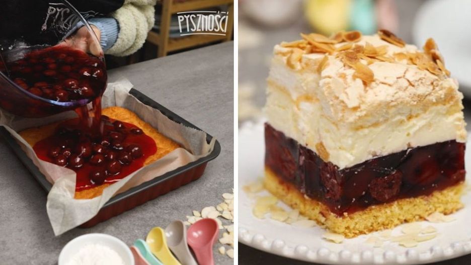 Pyszny deser z zabawną nazwą skradnie Twoje serce. Ciasto Zemsta Teściowej to połączenie kruchego ciasta, wiśni, kremu śmietankowego i bezy. Palce lizać!