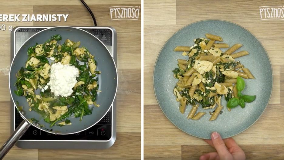 Ciemny makaron ze szpinakiem i serkiem ziarnistym