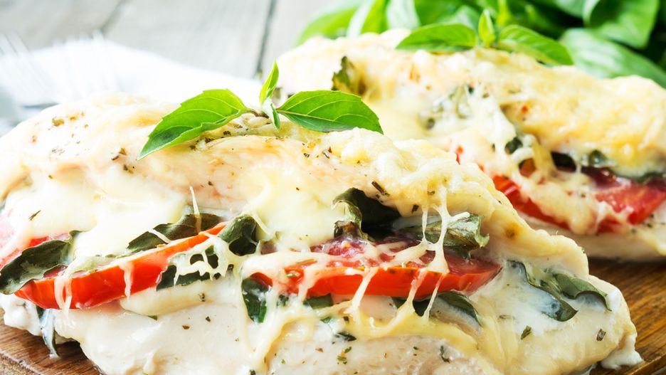 - Na 10 minut przed końcem pieczenia wyjmij blachę i na wierzch filetów połóż plastry pomidora i mozzarelli.