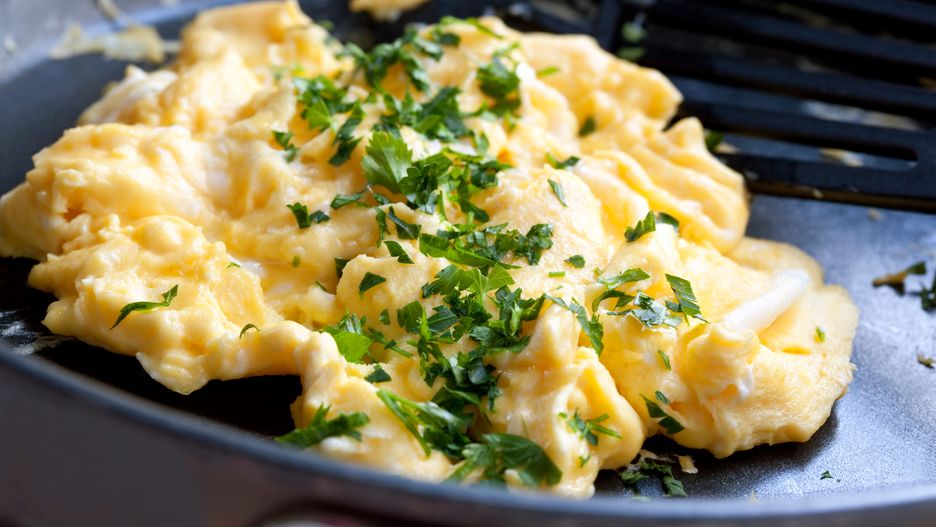 Jajecznicę od razu po usmażeniu przełóż na talerz. Jeśli dłużej pozostawisz ją na patelni, bardziej się zetnie i już nie będzie taka kremowa w smaku. Posyp świeżymi ziołami, na przykład natką pietruszki.