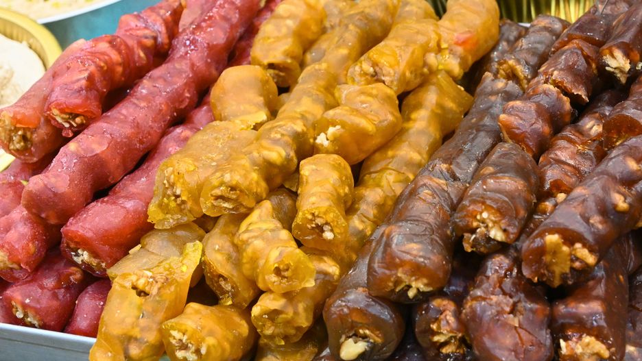 To prawdziwa bomba energetyczna. Jej bazą są bowiem orzechy włoskie, czasem także laskowe lub migdały. Nawleka się je na długą nić, tworząc coś na kształt naszyjnika. Nie obędzie się tutaj bez gęstego syropu winogronowego, gotowanego z dodatkiem mąki. Ma być gęsty jak kisiel lub budyń, bo pełni rolę spoiwa. Czasem używa się także soku z granatu, jabłek czy morwy, by stworzyć inne wersje smakowe czurczcheli.