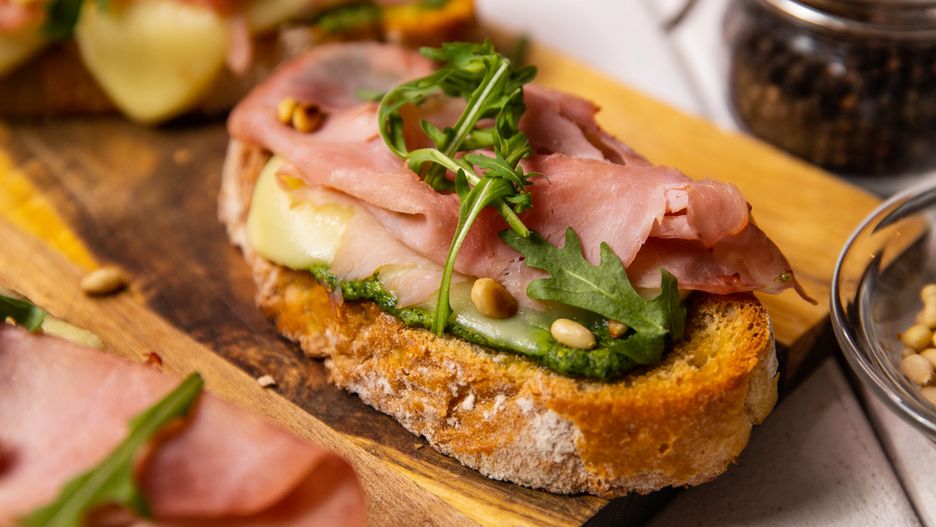Crostini cotto z pesto z rukoli i nie potrzebujesz nic więcej, aby zaserwować swoim bliskim przepyszną kolację. Ślinka cieknie od samego patrzenia!