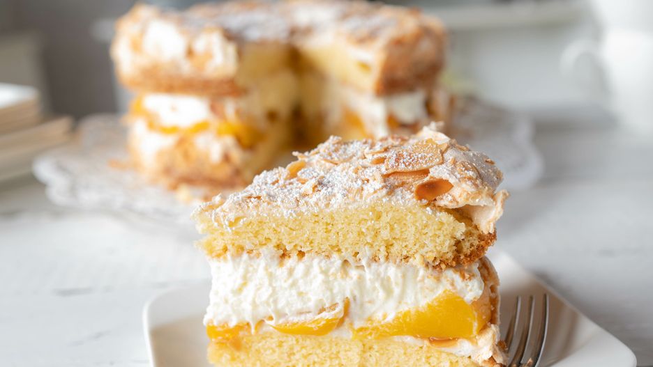 - Wyłóż na warstwie ciasta i piany drobno pokrojone brzoskwinie.