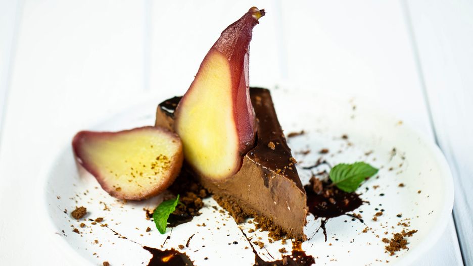 Czekoladowy sernik z gruszkami duszonymi w winie