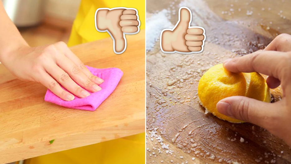 Oprócz standardowego czyszczenia deski przy pomocy płynu do mycia i ciepłej wody oraz sprayu dezynfekującego, warto raz w miesiącu dodatkowo wyczyścić ją przy pomocy mieszanki składającej się z 2 składników - soli gruboziarnistej oraz cytryny. Po pierwsze posyp powierzchnię deski solą. Następnie weź połówkę cytryny i dokładnie przetrzyj nią deskę. Odstaw czyszczony przedmiot na kilka minut, po czym umyj go w ciepłej wodzie. Cytryna pomoże także pozbyć się nieprzyjemnego zapachu z czyszczonej deski.