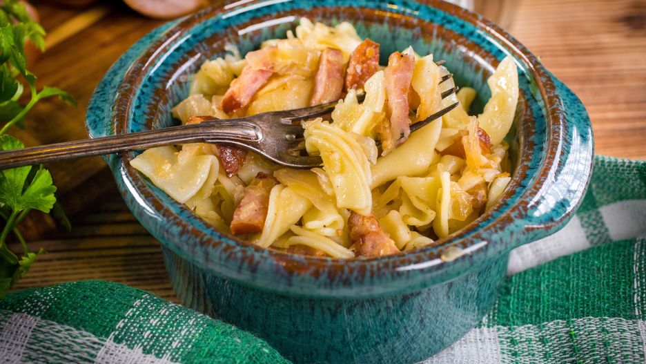 - Wymieszaj łazanki z zawartością garnka, dopraw solą, pieprzem i posiekaną natką pietruszki. Podawaj od razu.
